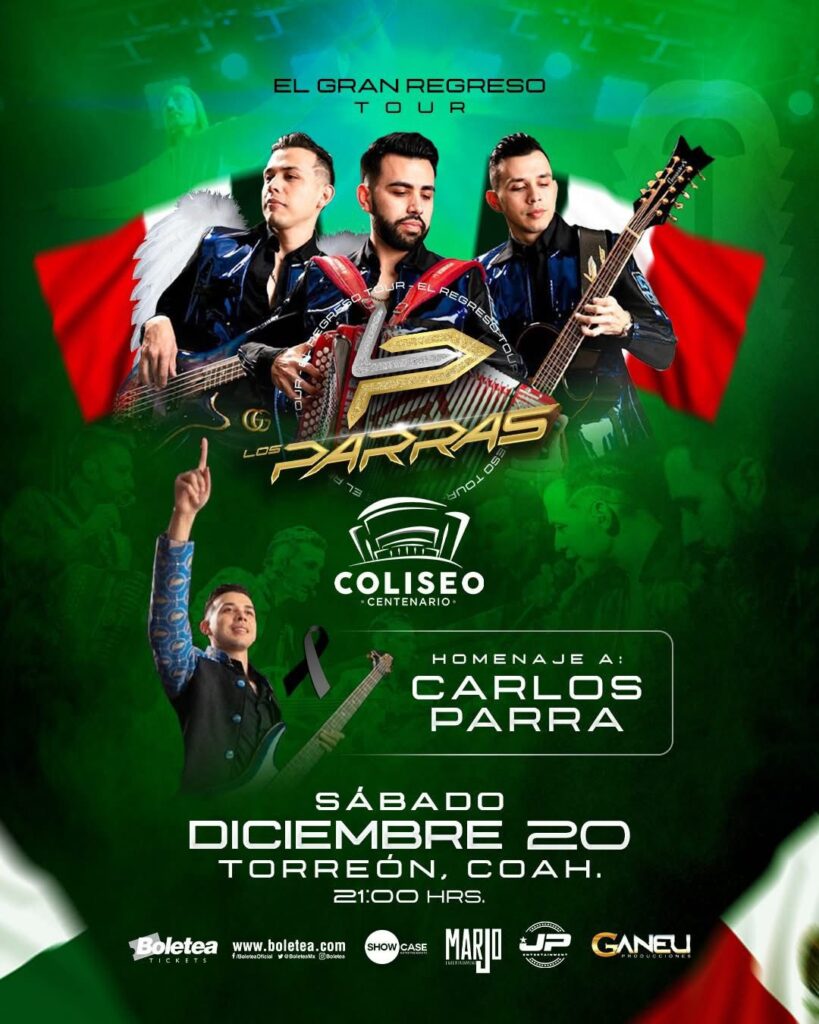 Por primera vez en la Comarca Lagunera, la agrupación de música regional mexicana Los Parras se presentará en el Coliseo Centenario. El concierto está programado para el próximo sábado 20 de diciembre de 2025 y forma parte de “El Gran Regreso Tour”, una gira dedicada a la memoria de su vocalista y hermano menor, Carlos Parra.